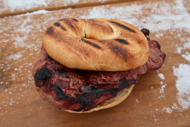 Gegen kurz nach 9 Uhr waren wir dann in Vail und fuhren direkt in die Game Creek Bowl. Es hatte tatsächlich ordentlich geschneit – auch wenn es nicht ausgereicht hatte alle ausgefahrenen Stellen aufzufüllen und man zum Teil verharschte Stellen unter dem neuen Schnee hatte. An einigen Stellen gab es aber unglaublich guten Powder und wir hatten einen Wahnsinnstag in den Back Bowls von Vail. Mittags grillten wir uns dann auf dem Gasgrill 4 schöne Steaks und hatten die im Bagel – sehr lecker! Danach ging es noch mal für gute 2 Stunden auf die Skier…