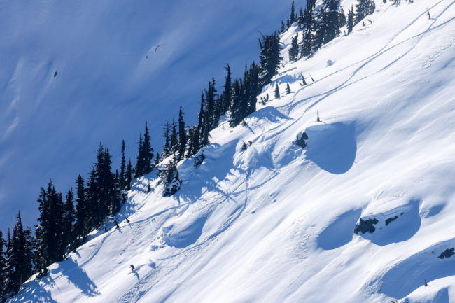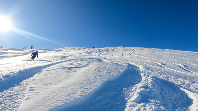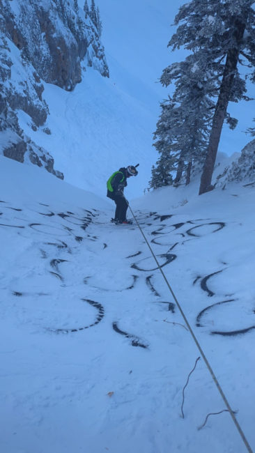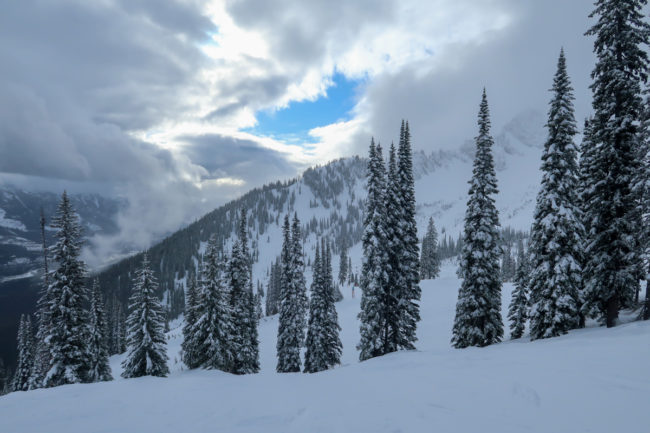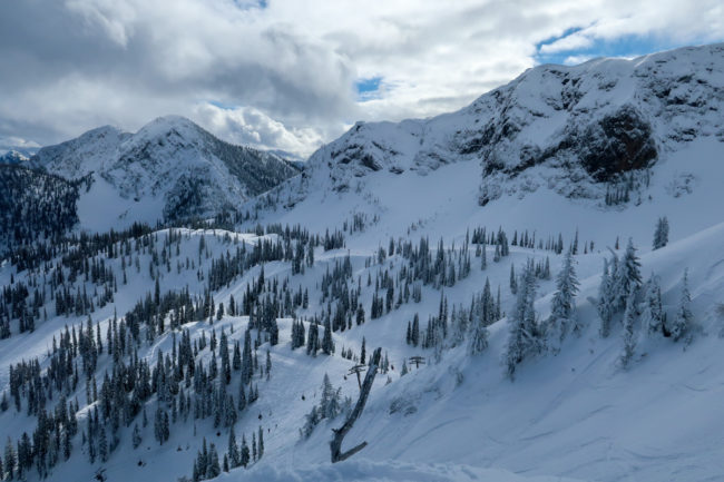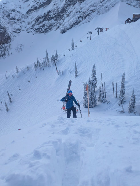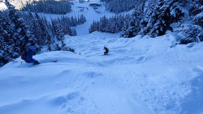 Mit dem zweiten Lift kamen wir oberhalb der Schneefallgrenze raus und es hatte gut 15 cm neuen Schnee in der Bowl. So fuhren wir zuerst in der Cedar Bowl und machten uns danach auf den Weg in die Timber Bowl. Die Fahrten zwischen den Bäumen war großartig – Holger versuchte dann in eine Rinne reinzukommen und hatte erst mal zu tun – am Ende klappte es aber.
