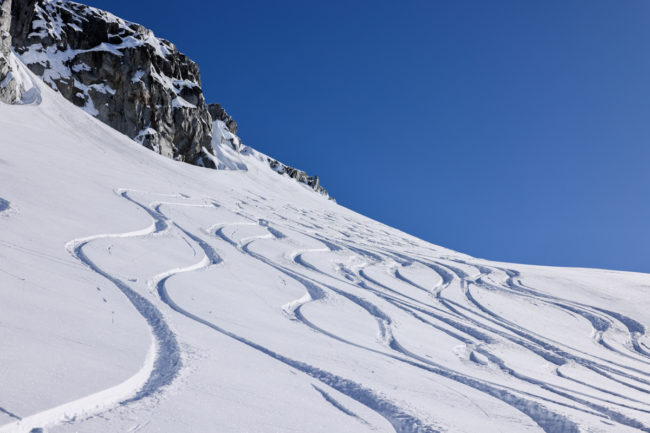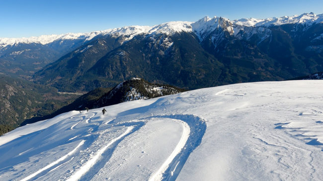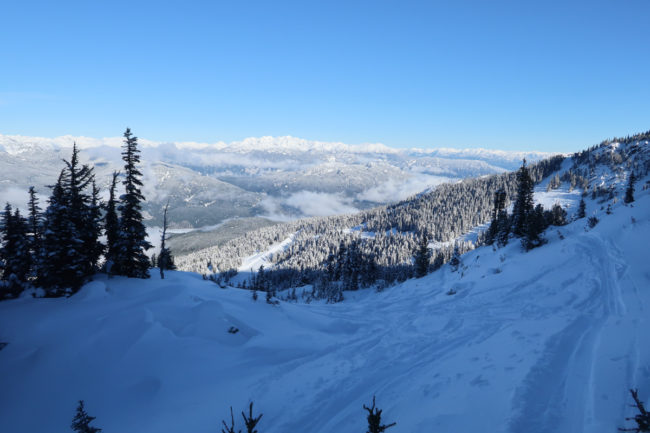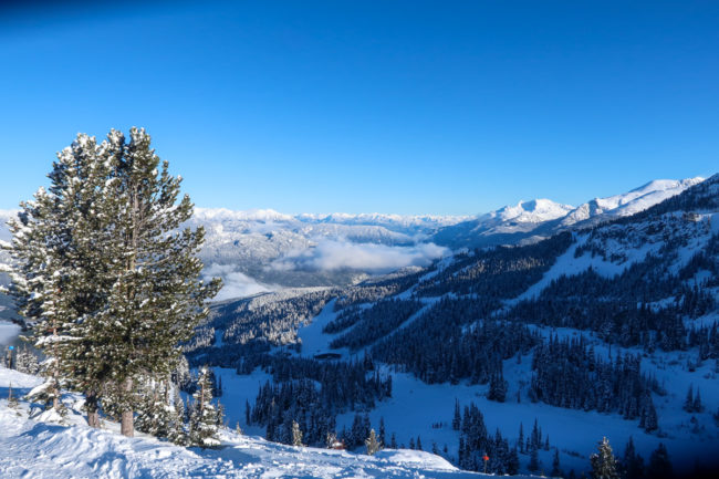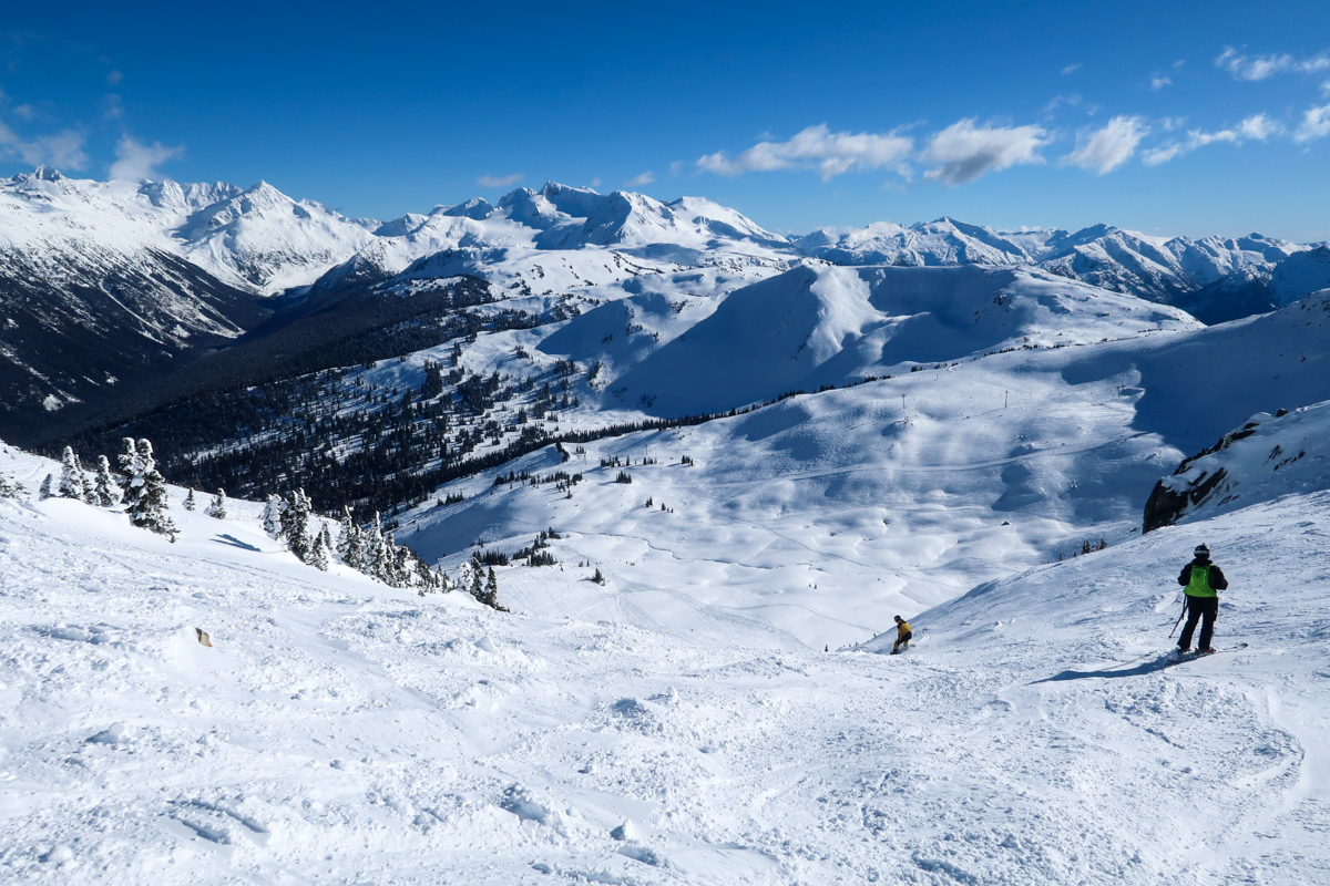 Wir fuhren zuerst auf den Blackcomp Mountain – die oberen Lifte waren allerdings im gesamten Skigebiet gesperrt und man hörte die ganze Zeit die Lawinensprengungen. Irgendwann gegen 10.30 Uhr öffnete dann auch der Glacier Express und man kam nach oben. Von dort hatte man einen unglaublichen Ausblick.