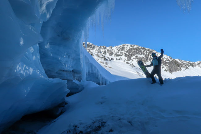 Ich traute mich nicht und fuhr ein Stück in die davor liegende Bowl zurück. Die Abfahrt war dann aber leider schrecklich – auch dort ging es durch eine recht schmale Felsrinne, nur war diese total vereist und felsig. In der Nachbarrinne lagen zwei andere Skifahrer drin…..
