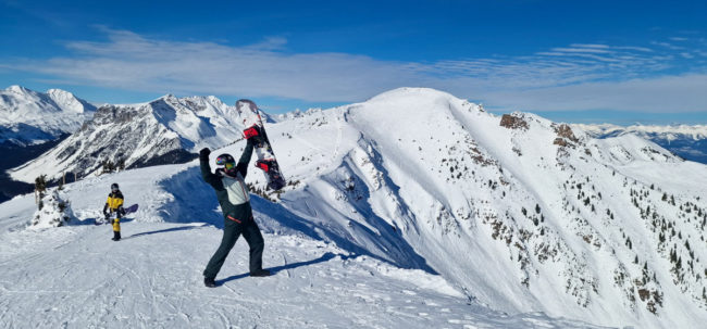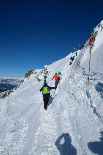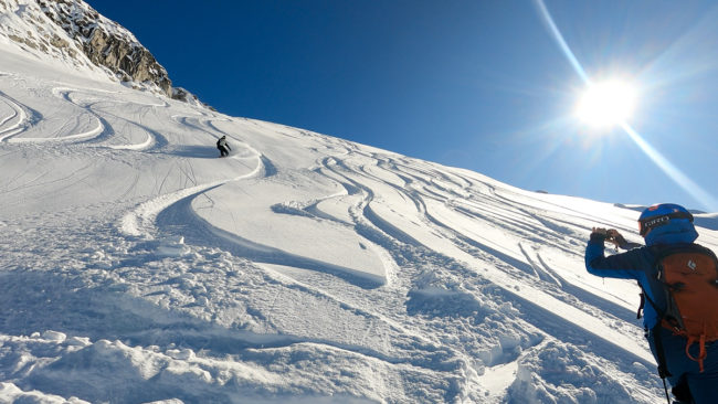 Es gab 2 Gruppen mit 4 Personen und eine Gruppe mit 3 Personen. Den letzten Platz dort nahm ein Fotograf ein. Es war relativ windig – das merkte man dann auch gleich zu Beginn beim ersten Flug. Und auch oben am Gipfel war es recht stürmisch. Als wir den Gipfel verlassen hatten, wurde es deutlich besser. Der erste Run war gar nicht so lang, war aber sehr gut zum Einfahren. Und der Schnee war bereits dort sehr gut….