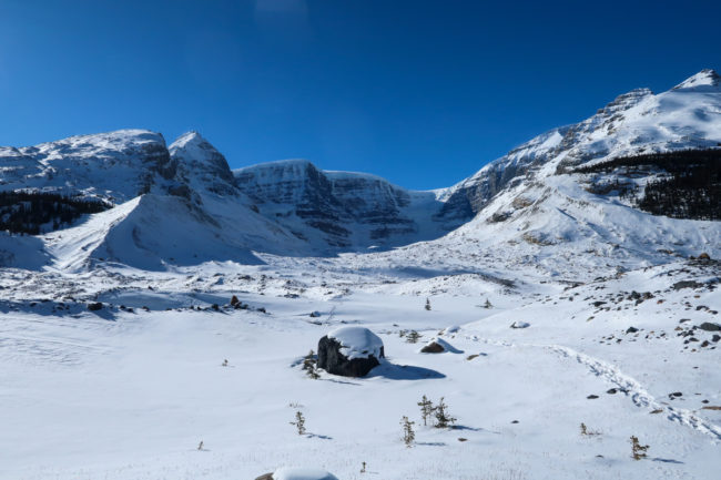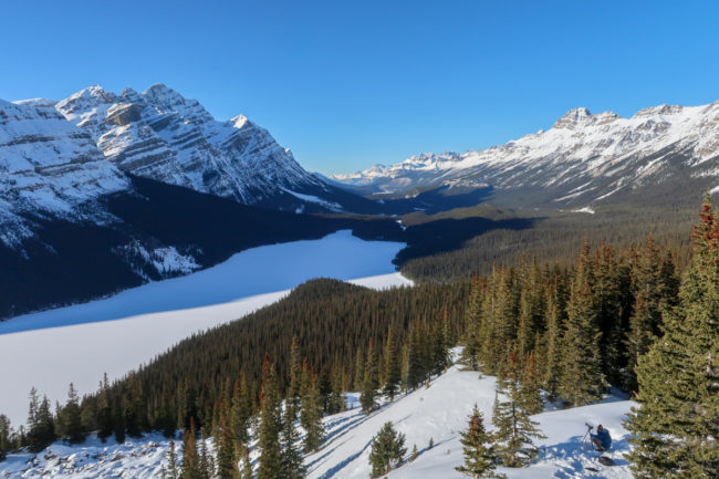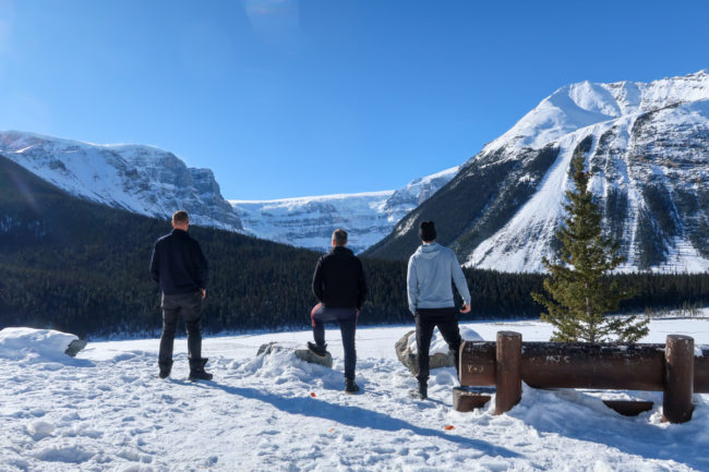 Ein Stück weiter gab es dann einen größeren Parkplatz, wo man den Ausblick zumindest aus der Ferne sehr genießen konnte. Danach ging es weiter durch den Nationalpark – am Ende gab es noch eine kleine Wanderung zu einem Aussichtspunkt oberhalb des Peyto Lake. Dort hatte man eine unglaubliche Aussicht auf den zugefrorenen See und die umliegenden Berge….