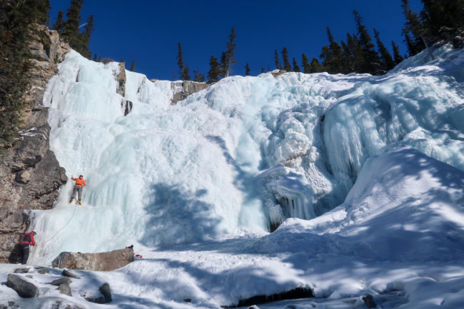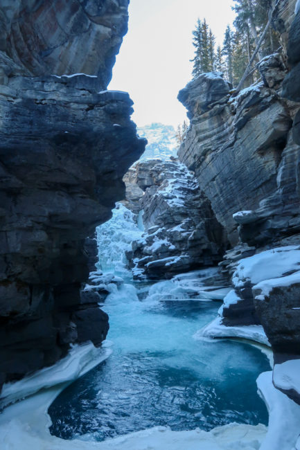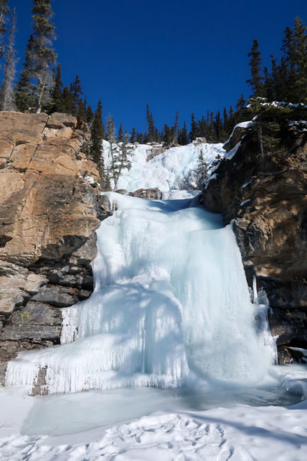 Am Eingang mussten wir 22 CAD Eintritt bezahlen und dann kann die Fahrt durch die beeindruckende Landschaft auch schon los. Der erste Stopp waren vereiste Wasserfälle bei denen man über den zugefrorenen Fluss in eine Schlucht bis kurz vor den Wasserfällen laufen konnte. Ein sehr schöner Start in den Tag.