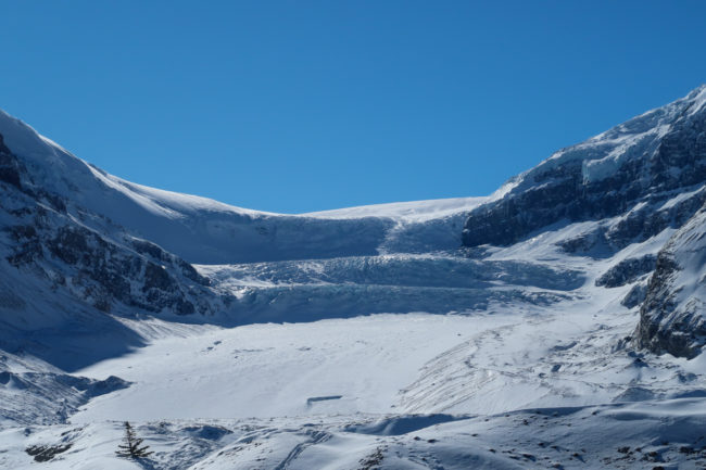 Und danach hatte man nach jeder Kurve wieder ein Staunen hinsichtlich der landschaftlichen Schönheit….Es folgten zwei weitere Wasserfälle, beim letzten sahen wir Eiskletterer. Und danach kamen wir dann zum Columbia Icefield – einem unglaublich beeindruckenden Gletscher. Wir versuchten eine kleine Wanderung hin zum Gletscher, hatten dafür aber nicht wirklich die richtigen Schuhe an.