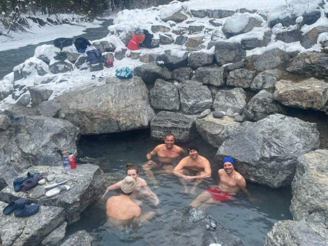 Die nächsten 3 Skitage hatten wir dann in Kicking Horse mit unglaublich steilem Gelände, dass man aber aufgrund des recht wenigen Schnees nicht wirklich komplett fahren konnte. Auf dem Weg nach Fernie fuhren wir dann noch an heißen Quellen vorbei und genossen eine Stunde die heißen Quellen und die kurze Erfrischung im daneben liegenden Fluss.