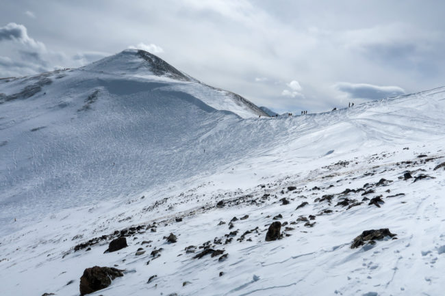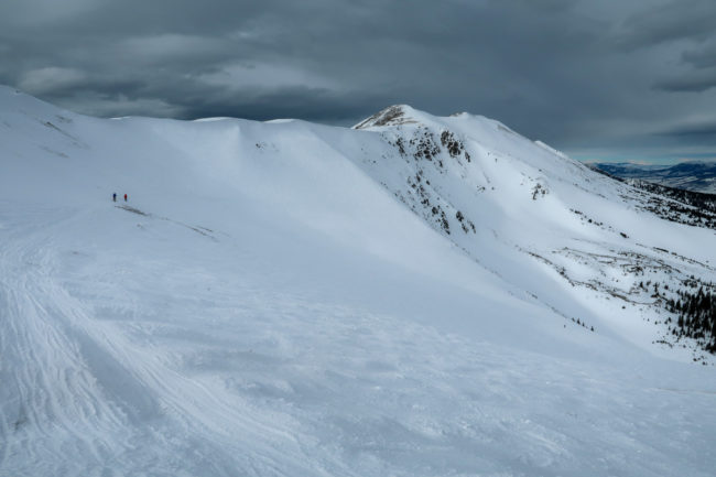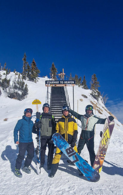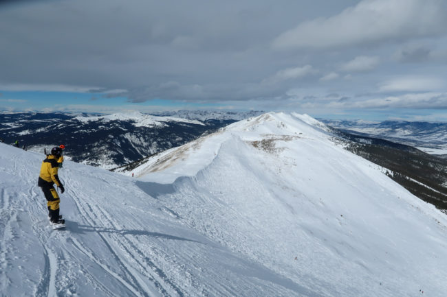 Wir stiegen bei knapp 4.000 Metern aus und stiegen dann noch in die Bowl auf – der kleine Anstieg war bei der Höhenlage und dem starken Wind doch herausfordernd. Danach fuhren wir am Rand der Bowl vorbei und stiegen bei einer Double-Diamond-Piste in den Schnee. Herausfordernd – wir kamen aber alle sicher nach unten. Danach fuhren wir noch mal mit dem Lift nach oben und stiegen auf der anderen Seite der Bowl aus. Holger und ich fuhren über einen recht ausgefahrenen Weg in die Bowl – Timo und Benny stiegen etwas weiter vorne ein….Und auch diese Abfahrt war herausfordernd.