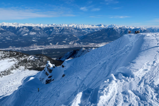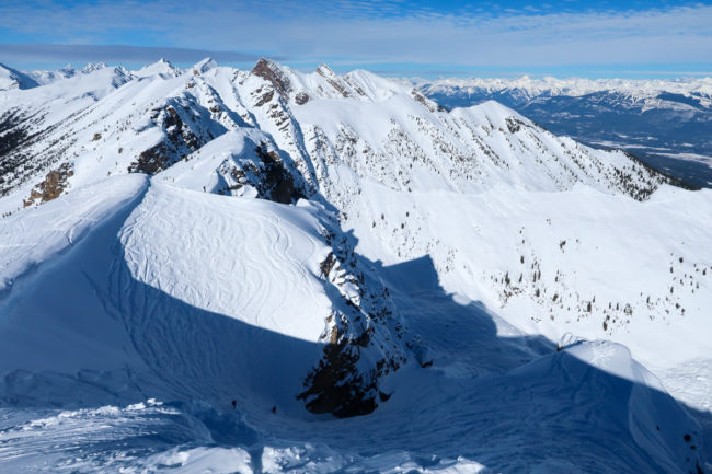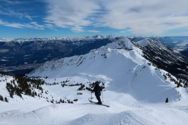Gegen 10 Uhr waren wir dann an der Gondel in Kicking Horse – die Sonne schien und der Himmel war strahlend blau. Aber auch hier gab es deutlich zu wenig Schnee und so probierten wir erst mal eine Abfahrt auf der langen Piste von 10 km bis ins Tal. Ein richtiges Vergnügen war es ehrlicherweise nicht.