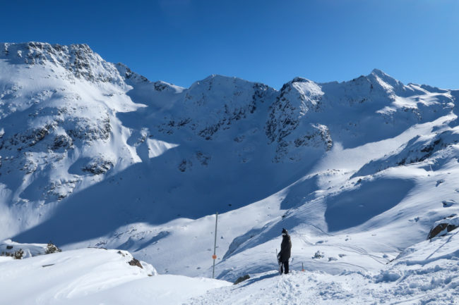 So fuhren wir also doch noch zum höchsten Punkt des Skigebiets. Es war sehr windig und die Sichtverhältnisse waren durchschnittlich…Die Einfahrt in die Bowl war zum Teil eisig, an einigen Stellen lagen Eisbrocken von vorherigen Lawinen auf der Piste. Wir kamen alle heile unten an – Holger und ich hatten sogar eine gute Linie mit frischem Schnee gefunden. Danach entschieden wir dann aber, dass es jetzt nicht das größte Vergnügen war und beließen es damit bei der einen Abfahrt.